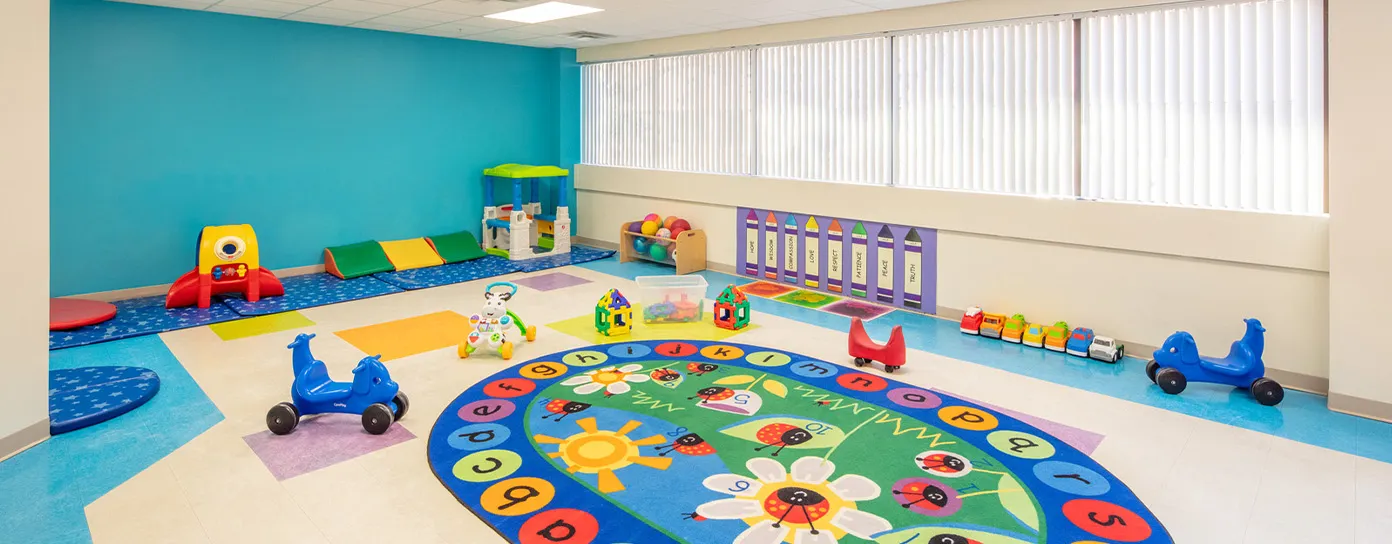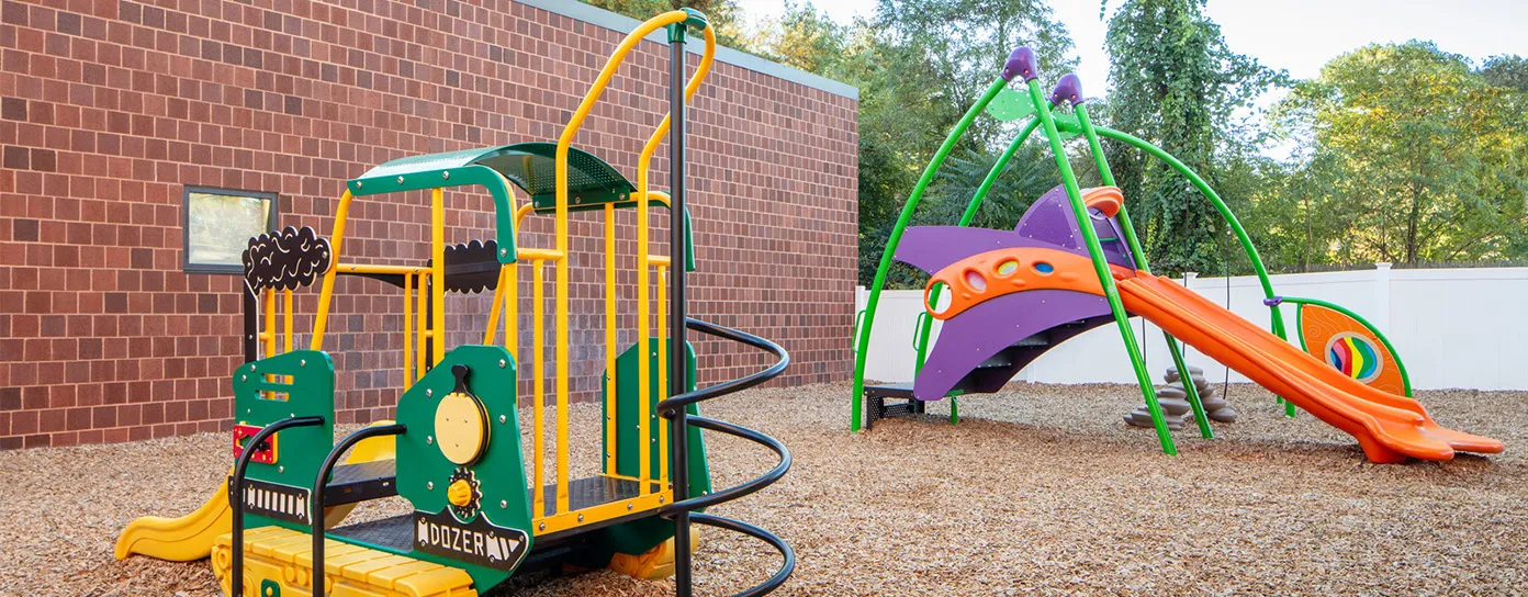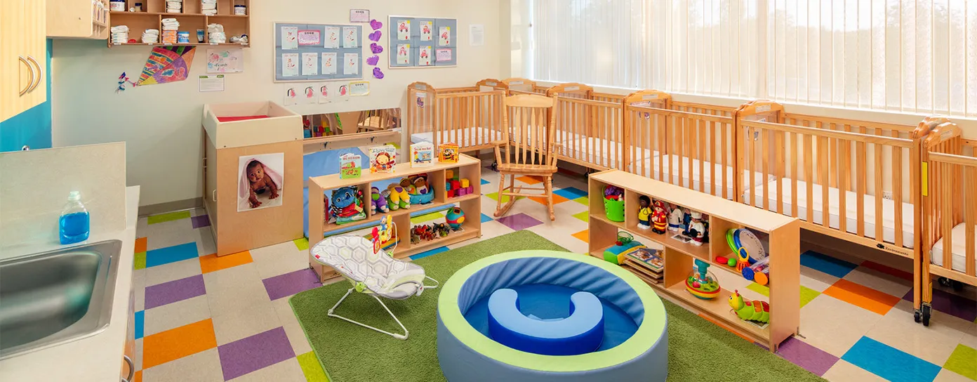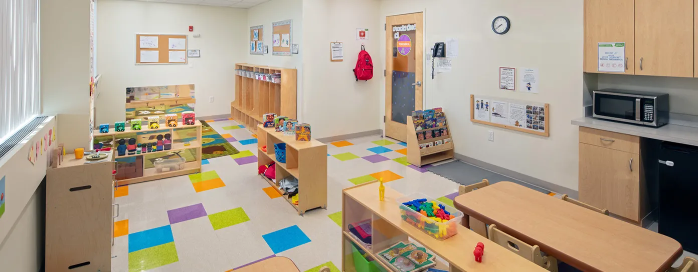 Our Dedham school features thoughtful touches like a private nursing room for parents and an indoor play space with a child-friendly bicycle track. Every classroom is intentionally arranged to support safe movement, imagination, and growth. Our daycare center also includes a dedicated gross motor room with STEAM experiences that give children space to move, explore, and engage in creative, hands-on learning. Outdoors, age-specific playgrounds allow infants, toddlers, and preschoolers to play and explore in fresh air, with spaces tailored to each developmental stage.