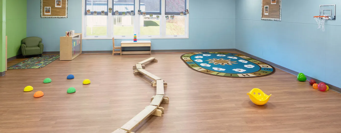 Our school includes nature-based, Reggio-inspired outdoor exploration spaces, nature stations in every age group, a dedicated gross motor room, and music every other week. Classrooms were recently refreshed with new flooring to create an even brighter, more inviting environment.