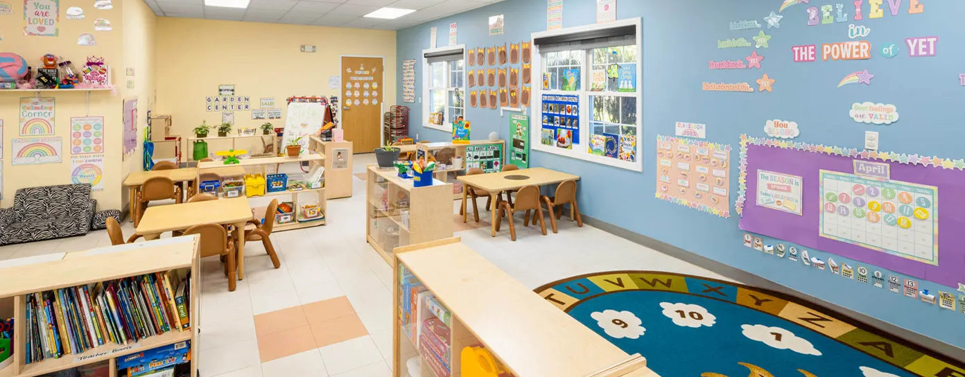 Our classrooms are designed to maintain supportive ratios and age-appropriate group sizes: Infants: 1:3 teacher-to-child ratio or 2:7, across two infant classrooms, Toddlers: 1:4 ratio or 2:9, with four open toddler rooms (ranging from infant–toddler to older 2–3-year-old groups), Preschool: 1:10 ratio or up to 2:15, Pre-K: 1:10 ratio or up to 2:20